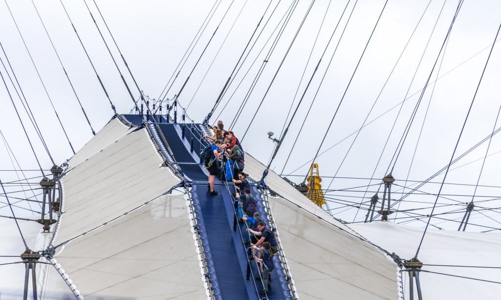 Outside, an attraction called “Up at the O2“, gives the opportunity to people not afraid of heights to climb over the canopy to the top of of the building to enjoy 360 degrees views of London from a platform on the roof.
